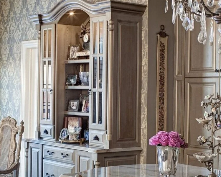 This house became a subtle refuge of quiet tones and antique style, accented with the owner’s favorite palette of soft blues and cream. The neutral palette belies exquisite details, with artisan-finished walls mounted with intricate moldings and antique patinas, crystal sconces, hand-painted furnishings from the European artisans of Ebanista and silk rugs. More than just an elegant space, the home was designed to be functional for the family, accommodating their needs and enhancing their life every day.